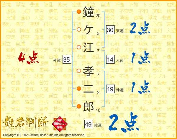 鐘ケ江孝二郎さんの人運は14画の1点!