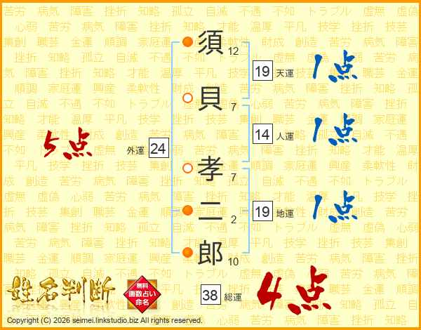 須貝孝二郎さんの総運は38画の4点!