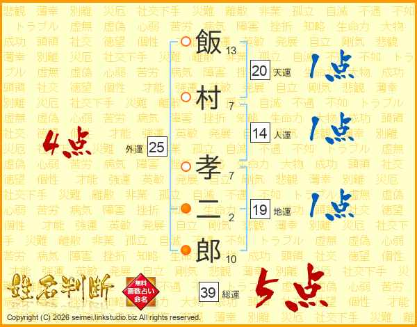 飯(13画)村(7画) 孝(7画)二(2画)郎(10画)