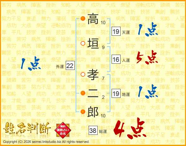 高垣孝二郎さんの総運は38画の4点!