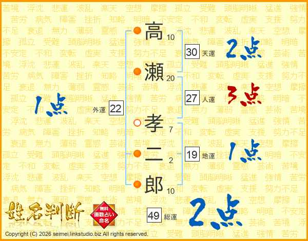 高(10画)瀬(20画) 孝(7画)二(2画)郎(10画)