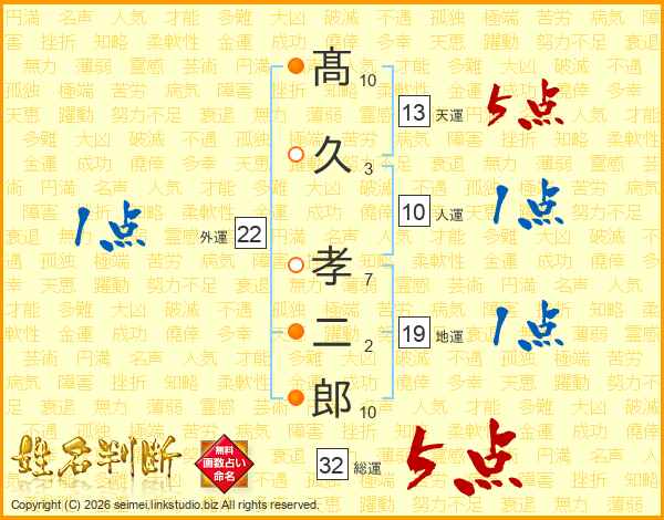 髙(10画)久(3画) 孝(7画)二(2画)郎(10画)