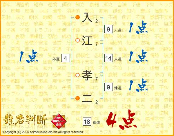 画数の奇数(○陽)と偶数(●陰)の配列で吉凶を占います。どちらかにかたよる名前は大凶名で避ける必要があります。画数の奇数偶数。