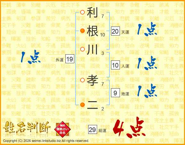 利(7画)根(10画)川(3画) 孝(7画)二(2画)