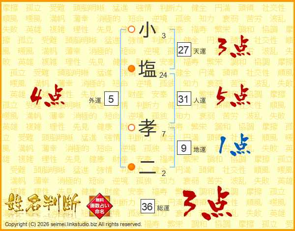 小(3画)塩(24画) 孝(7画)二(2画)