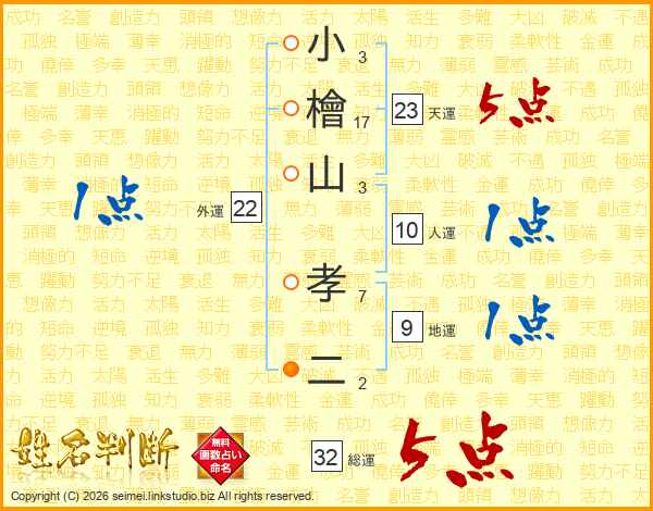 小(3画)檜(17画)山(3画) 孝(7画)二(2画)