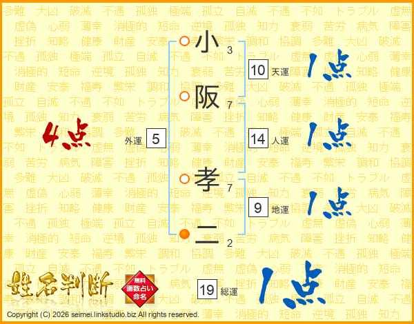 小阪孝二さんの総運は19画の1点!