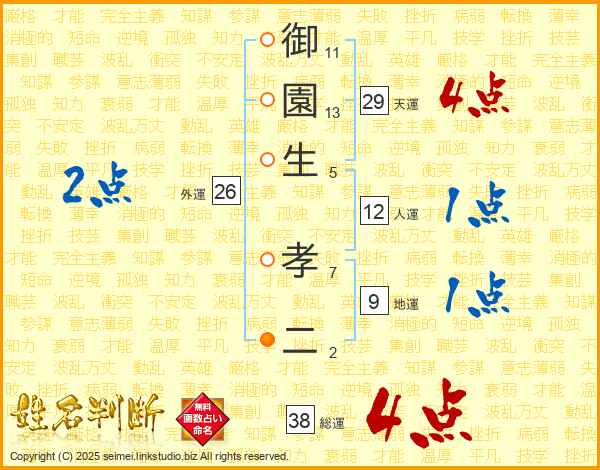 御(11画)園(13画)生(5画) 孝(7画)二(2画)