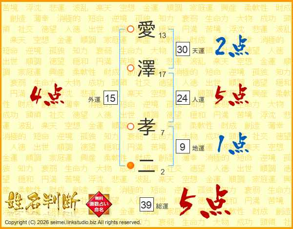 愛(13画)澤(17画) 孝(7画)二(2画)