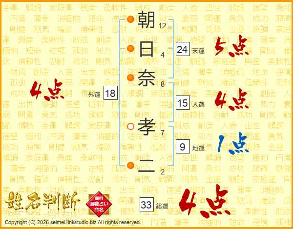 朝(12画)日(4画)奈(8画) 孝(7画)二(2画)