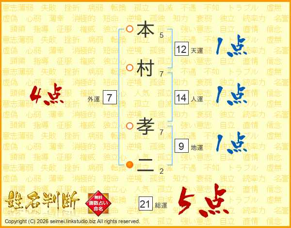 本村孝二さんの総運は21画の5点!
