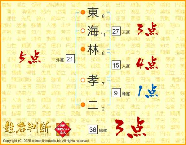 東(8画)海(11画)林(8画) 孝(7画)二(2画)