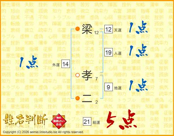 画数の奇数(○陽)と偶数(●陰)の配列で吉凶を占います。どちらかにかたよる名前は大凶名で避ける必要があります。画数の奇数偶数。