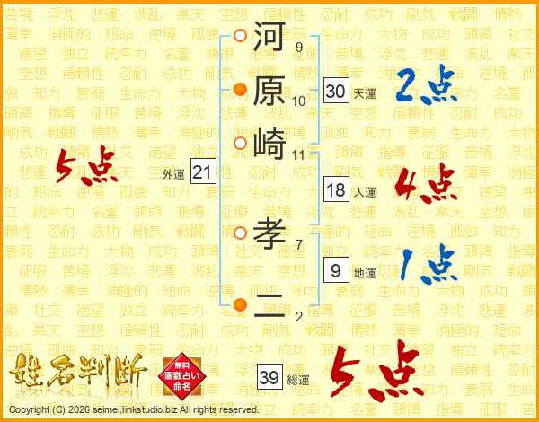 河原崎孝二さんの総運は39画の5点!
