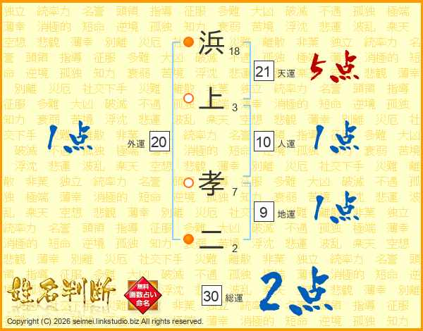 あなたの人生を表す1番重要な運勢です。生涯を通じて影響する総合運となり、主に50歳以降の晩年期に影響を及ぼします。苗字と名前の合計画数。