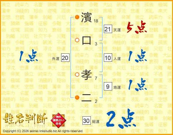 画数の奇数(○陽)と偶数(●陰)の配列で吉凶を占います。どちらかにかたよる名前は大凶名で避ける必要があります。画数の奇数偶数。