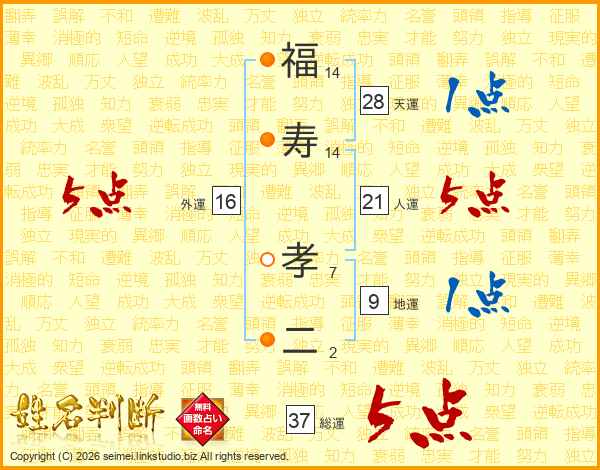 生活面を象徴する運勢です。外部から受ける影響力を表し、結婚運、家庭運や職場、環境への順応性を表します。総運から人運を引いた画数。姓や名が1文字の場合を除く。