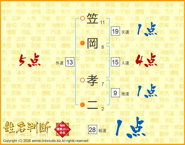 笠(11画)岡(8画) 孝(7画)二(2画)