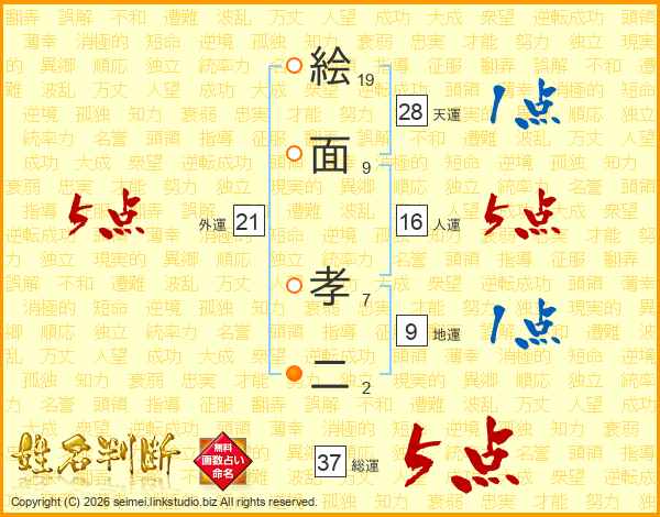 絵(19画)面(9画) 孝(7画)二(2画)