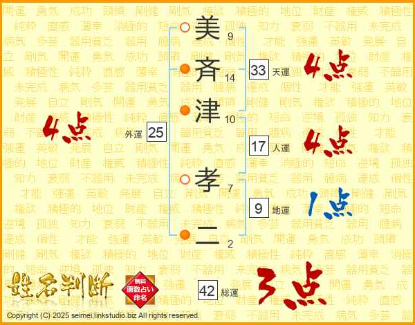 美(9画)斉(14画)津(10画) 孝(7画)二(2画)