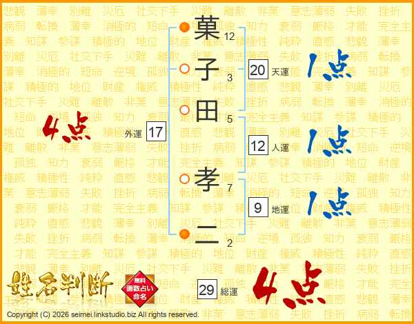 菓子田孝二さんの総運は29画の4点!