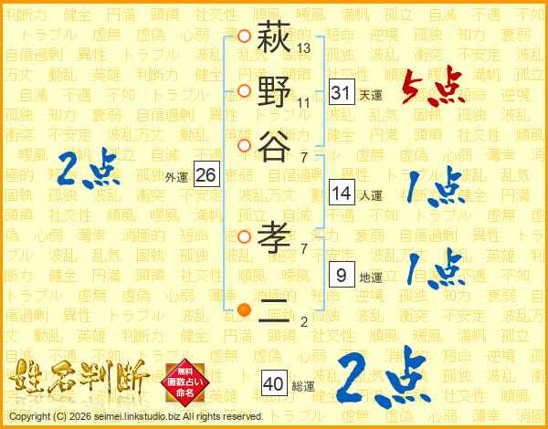 萩(13画)野(11画)谷(7画) 孝(7画)二(2画)