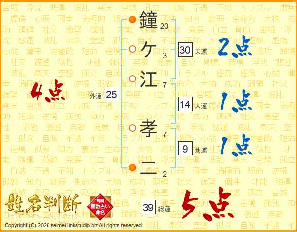 鐘ケ江孝二さんの総運は39画の5点!