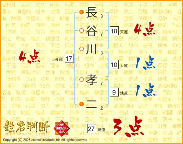 長(8画)谷(7画)川(3画) 孝(7画)二(2画)