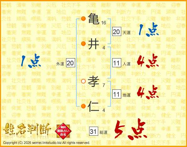 亀(16画)井(4画) 孝(7画)仁(4画)