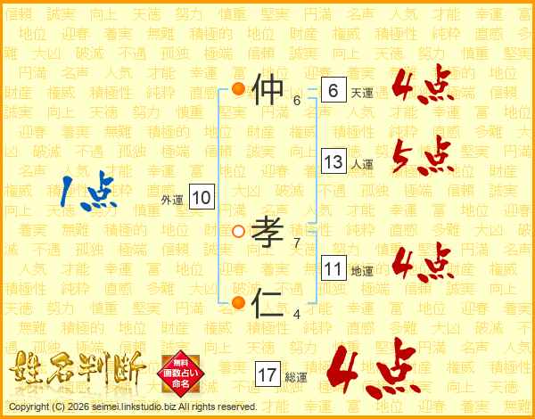あなたの人生を表す1番重要な運勢です。生涯を通じて影響する総合運となり、主に50歳以降の晩年期に影響を及ぼします。苗字と名前の合計画数。