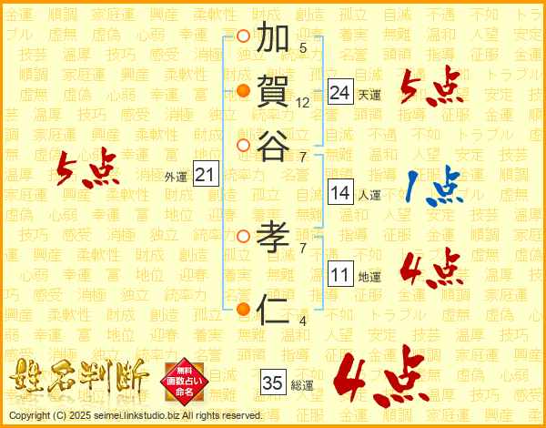 加(5画)賀(12画)谷(7画) 孝(7画)仁(4画)