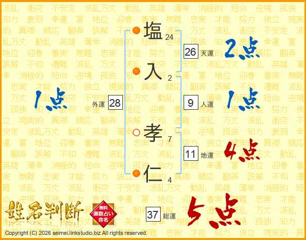 塩(24画)入(2画) 孝(7画)仁(4画)