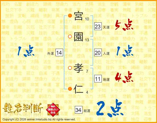 宮(10画)園(13画) 孝(7画)仁(4画)