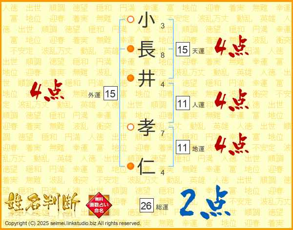 小(3画)長(8画)井(4画) 孝(7画)仁(4画)