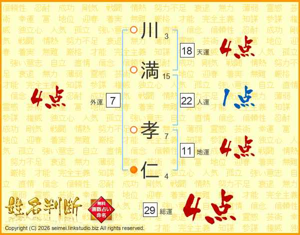 川(3画)満(15画) 孝(7画)仁(4画)