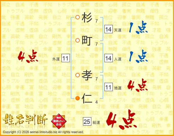 杉(7画)町(7画) 孝(7画)仁(4画)