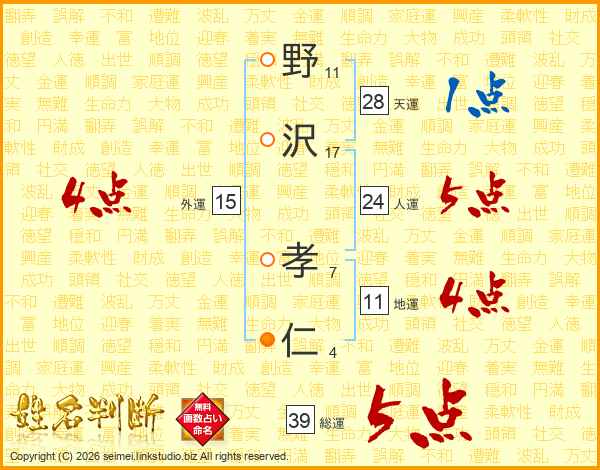 野(11画)沢(17画) 孝(7画)仁(4画)