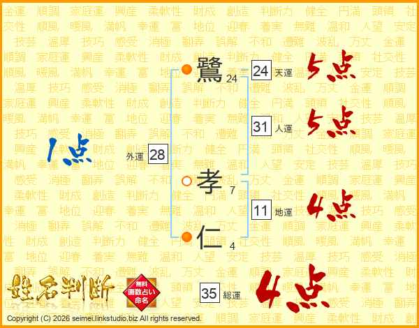 あなたの人生を表す1番重要な運勢です。生涯を通じて影響する総合運となり、主に50歳以降の晩年期に影響を及ぼします。苗字と名前の合計画数。