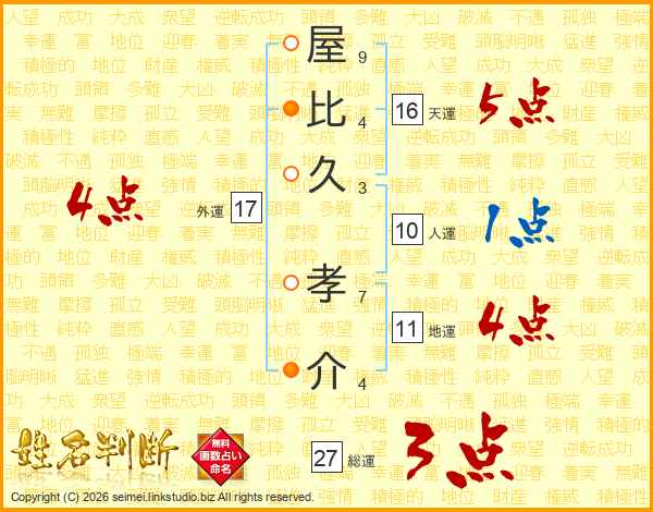 屋(9画)比(4画)久(3画) 孝(7画)介(4画)