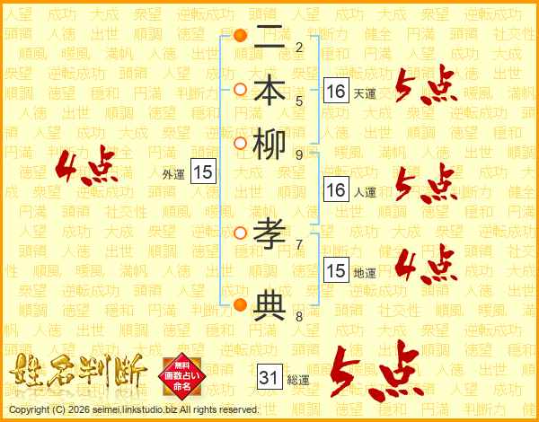二本柳孝典さんの総運は31画の5点!