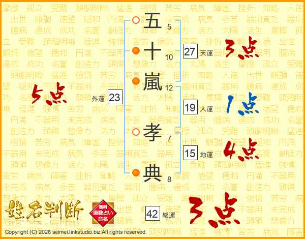 五(5画)十(10画)嵐(12画) 孝(7画)典(8画)