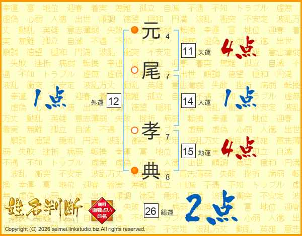 あなたの人生を表す1番重要な運勢です。生涯を通じて影響する総合運となり、主に50歳以降の晩年期に影響を及ぼします。苗字と名前の合計画数。