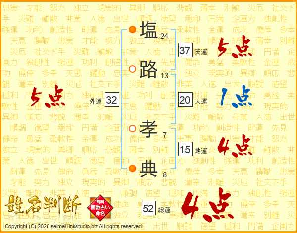 あなたの人生を表す1番重要な運勢です。生涯を通じて影響する総合運となり、主に50歳以降の晩年期に影響を及ぼします。苗字と名前の合計画数。
