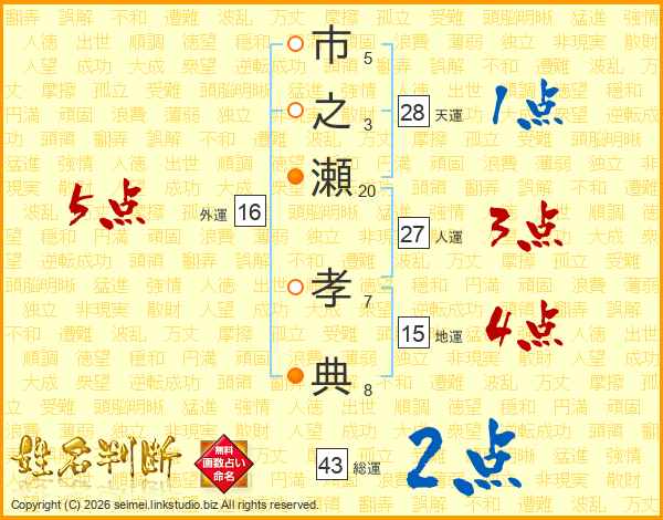 市(5画)之(3画)瀬(20画) 孝(7画)典(8画)