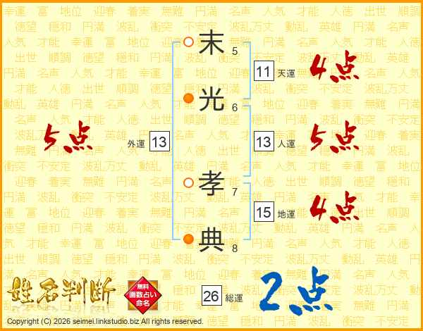 あなたの人生を表す1番重要な運勢です。生涯を通じて影響する総合運となり、主に50歳以降の晩年期に影響を及ぼします。苗字と名前の合計画数。