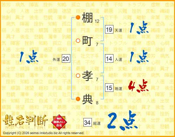 棚(12画)町(7画) 孝(7画)典(8画)
