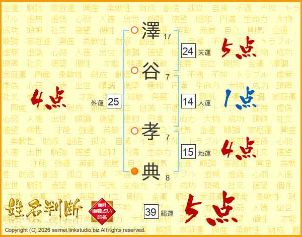 澤(17画)谷(7画) 孝(7画)典(8画)