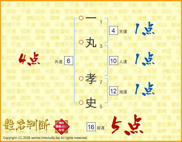 あなたの人生を表す1番重要な運勢です。生涯を通じて影響する総合運となり、主に50歳以降の晩年期に影響を及ぼします。苗字と名前の合計画数。