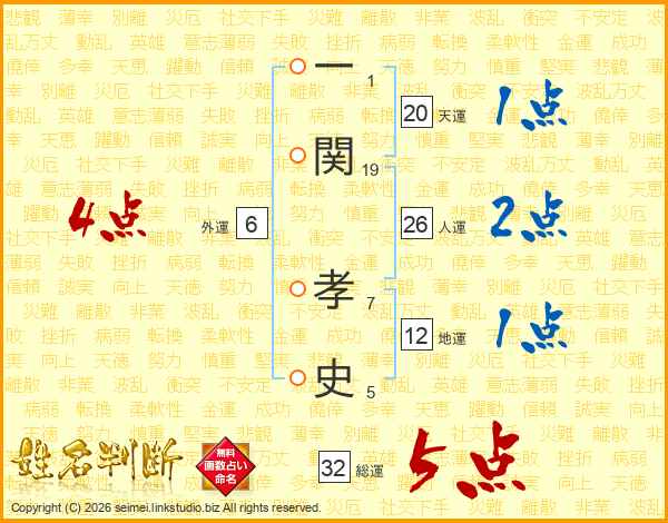一(1画)関(19画) 孝(7画)史(5画)