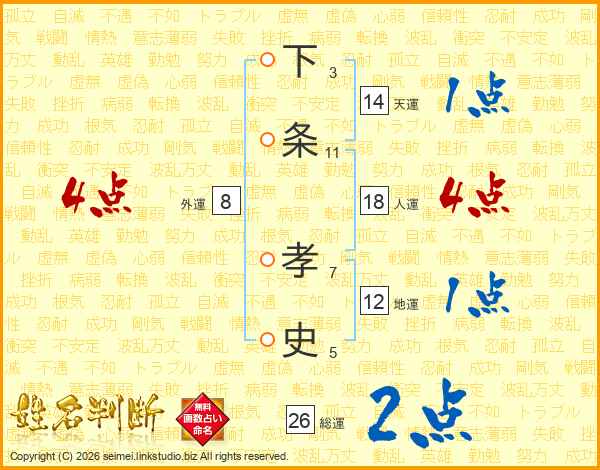 生活面を象徴する運勢です。外部から受ける影響力を表し、結婚運、家庭運や職場、環境への順応性を表します。総運から人運を引いた画数。姓や名が1文字の場合を除く。